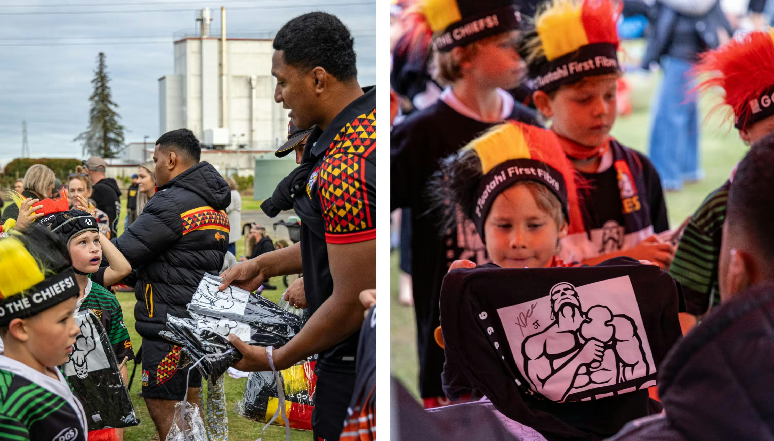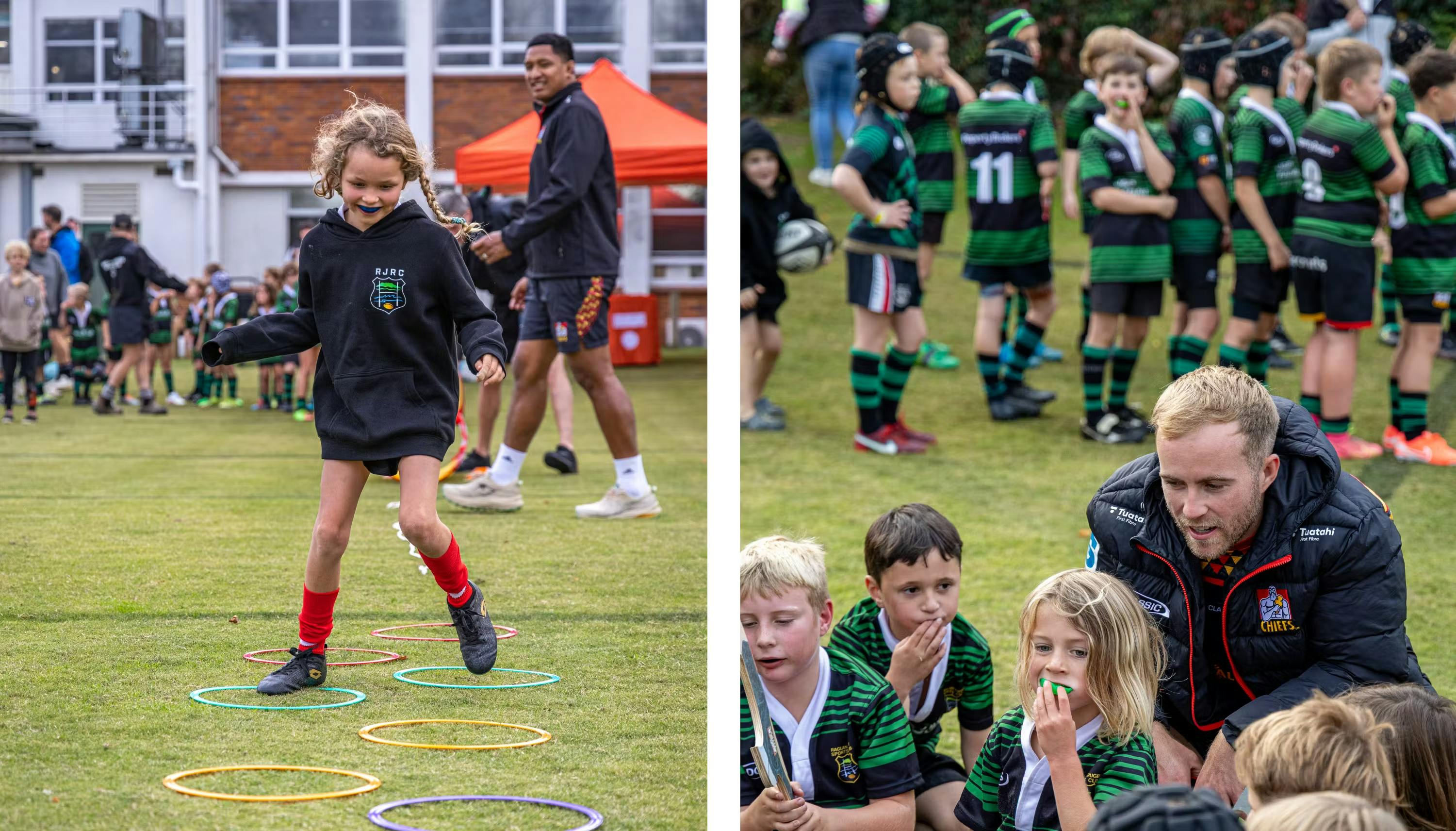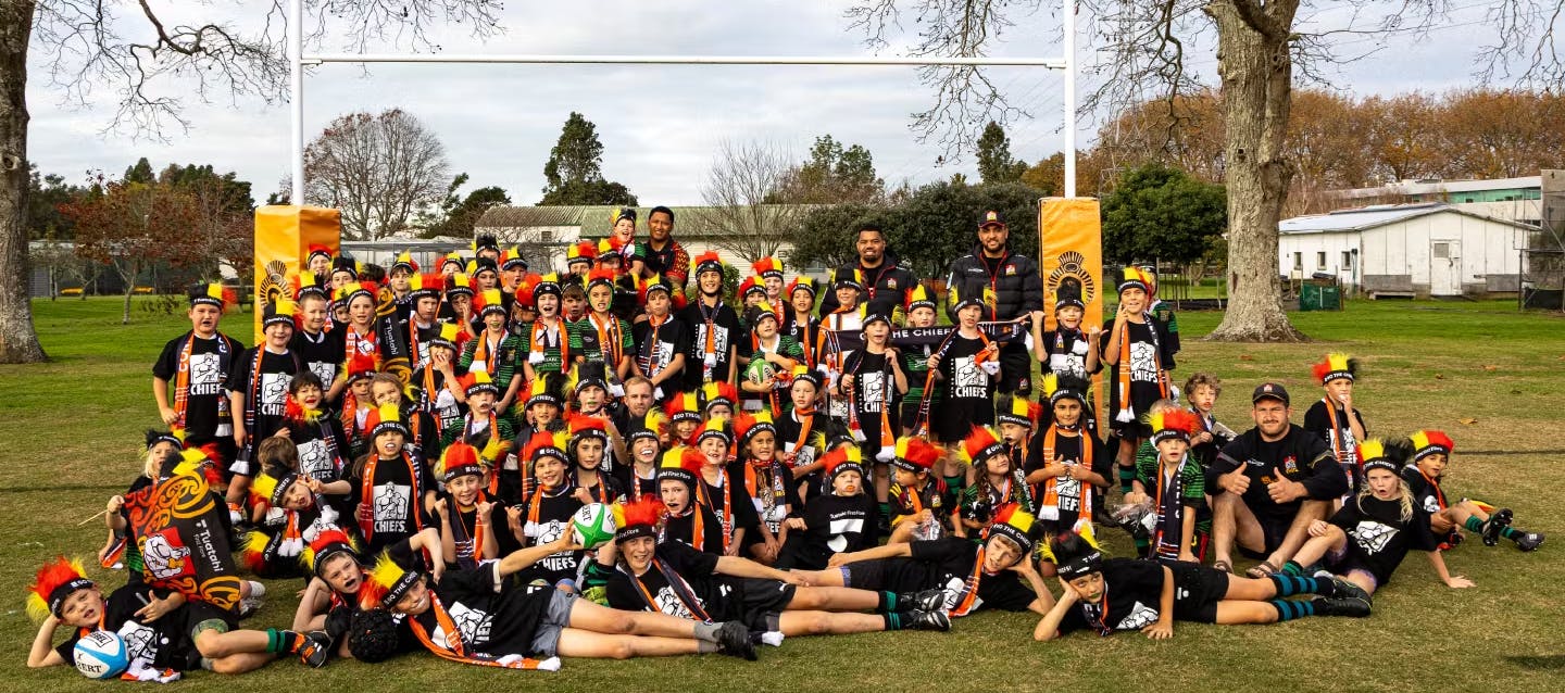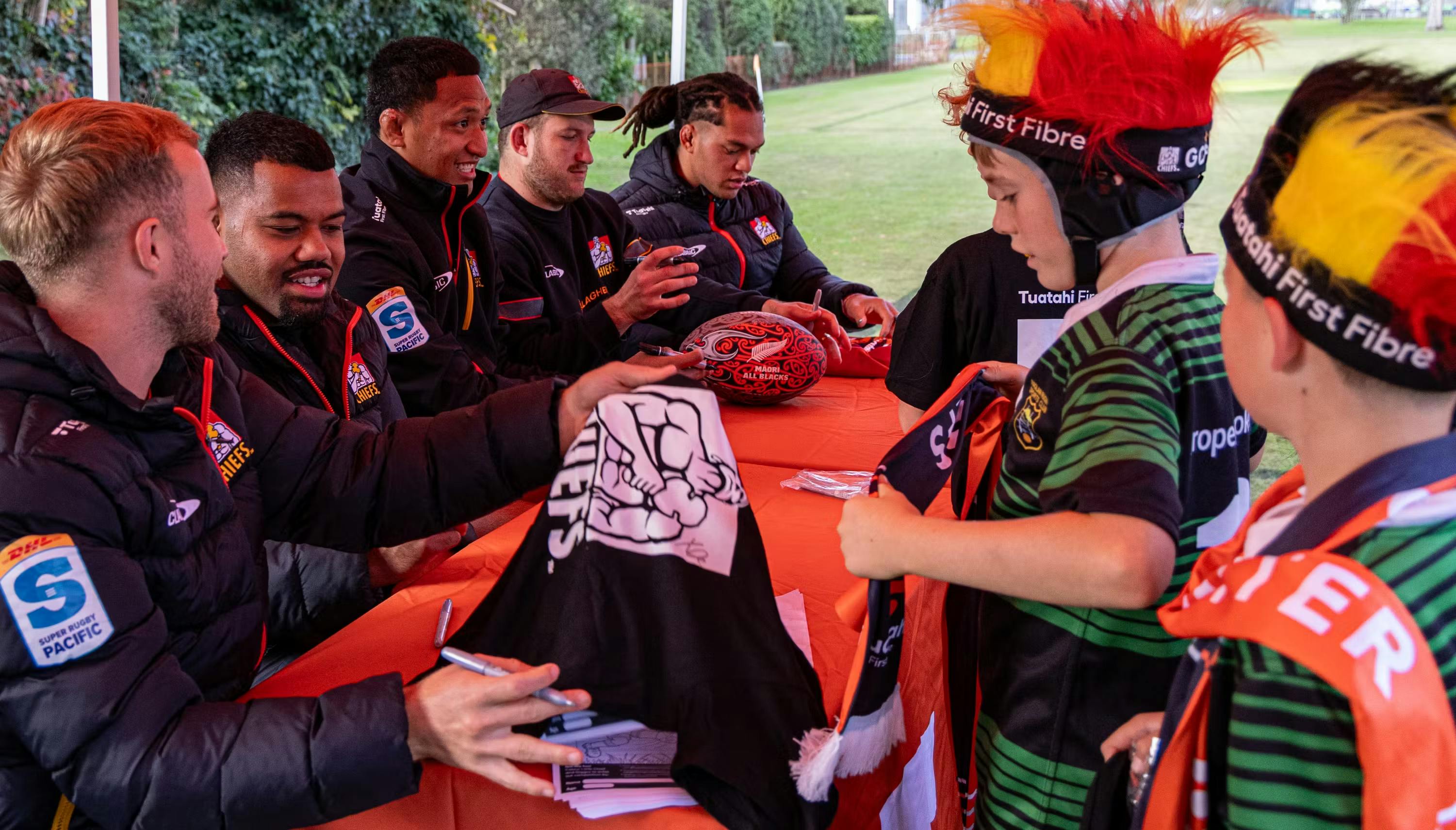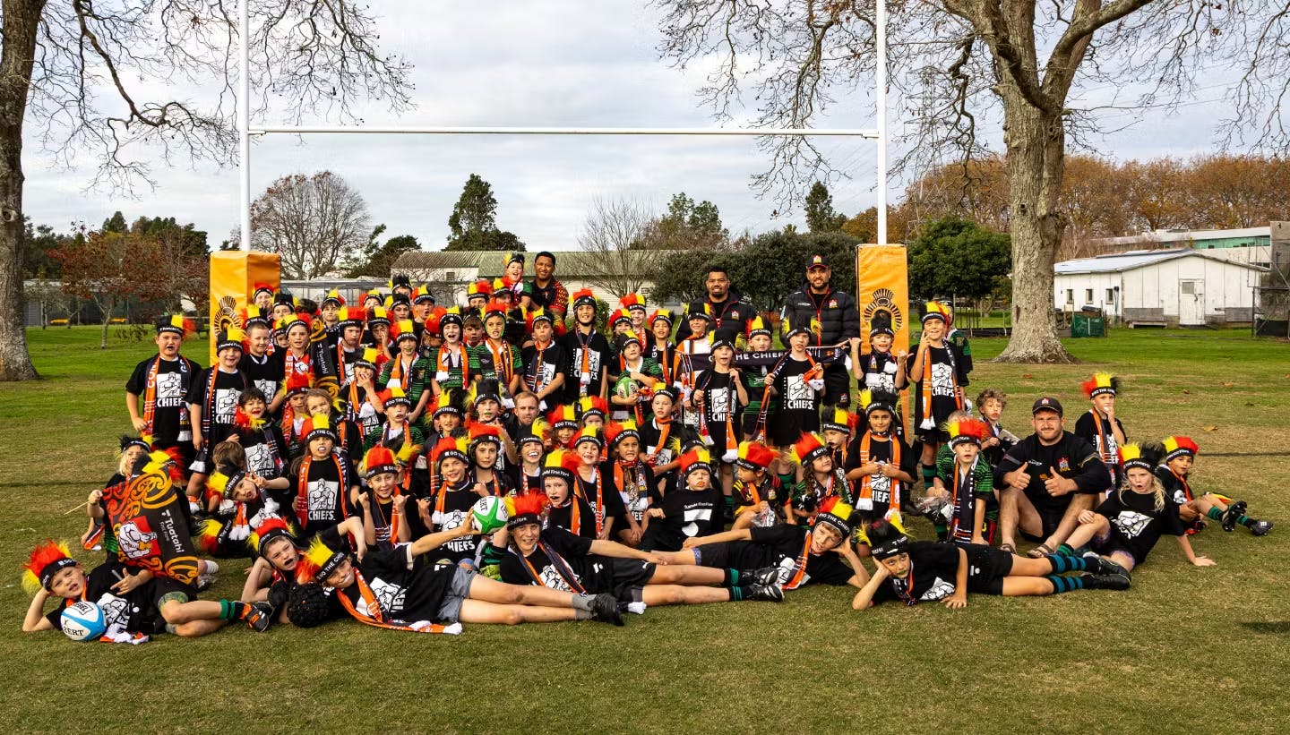 Chiefs players Samipeni Finau, Samisoni Taukei’aho, Xavier Roe, Bradley Slater, Jahrome Brown, and Naitoa Ah Kuoi led the action, running a variety of fun activities including a skills session, bullrush, an obstacle course, and a rugby-themed puzzle and trivia challenge. They wrapped up the afternoon handing out merch, signing autographs, and posing for photos with the excited junior players.