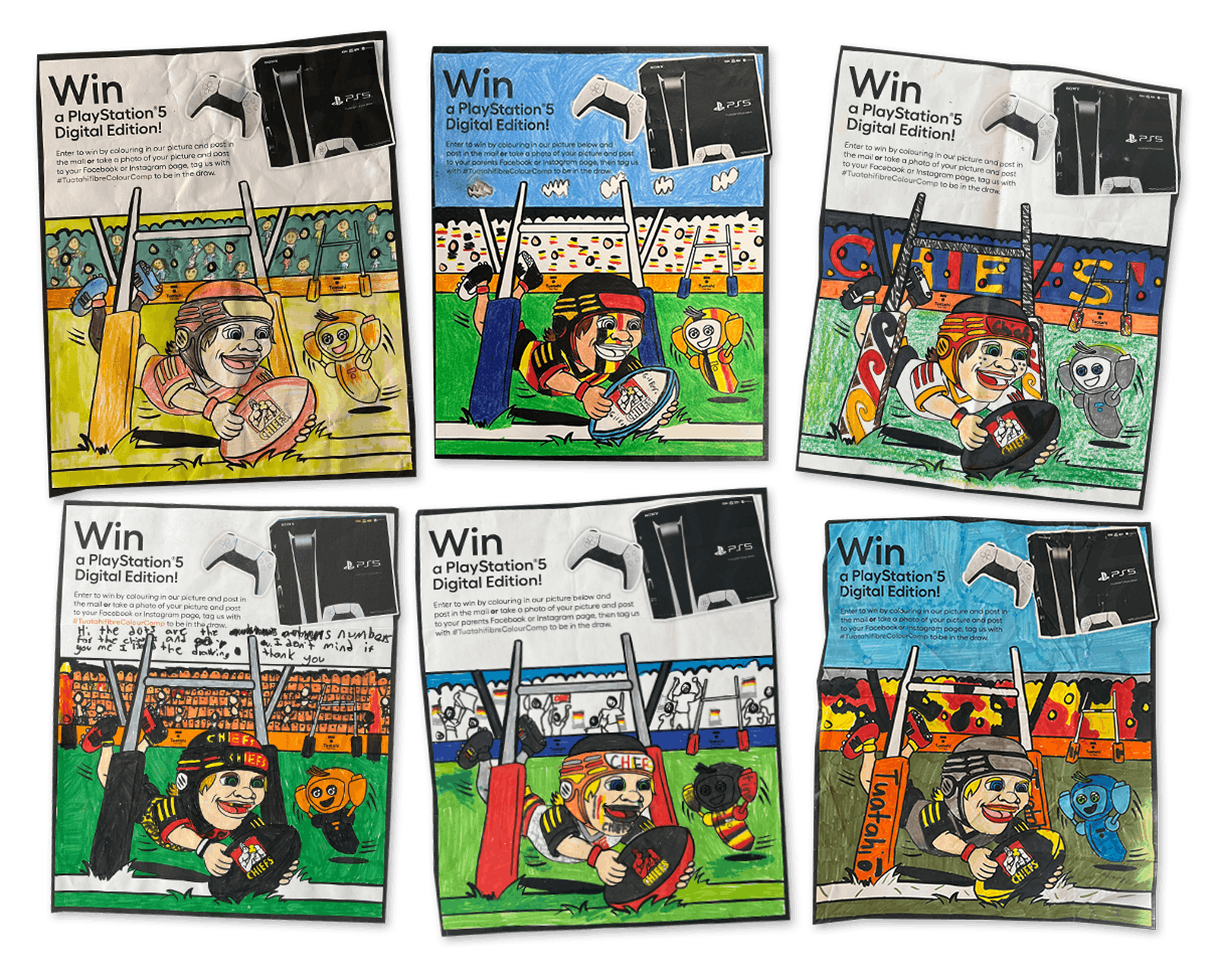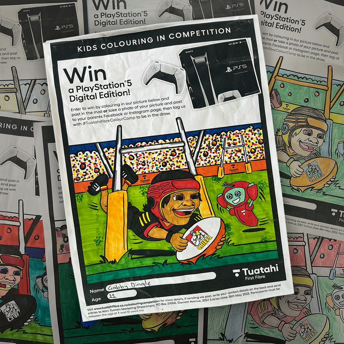 The idea for the #TuatahifibreColourComp originated from our passion for rugby and unwavering support for the Gallagher Chiefs. This initiative kicked off at the start of the Super Rugby Pacific season and concluded just before the eagerly anticipated finals. To ensure wide participation, entry forms were distributed at every home game hosted at FMG Stadium Waikato, as well as during various events held throughout the season.